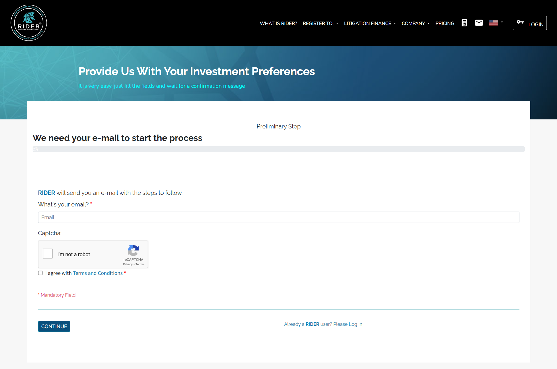 The RIDER platform is a secure portal with a private section for individual investors. In this section of the RIDER platform, you will find your individual investors dashboard, where you will be able to monitor the progress of the legal disputes in which you have invested.